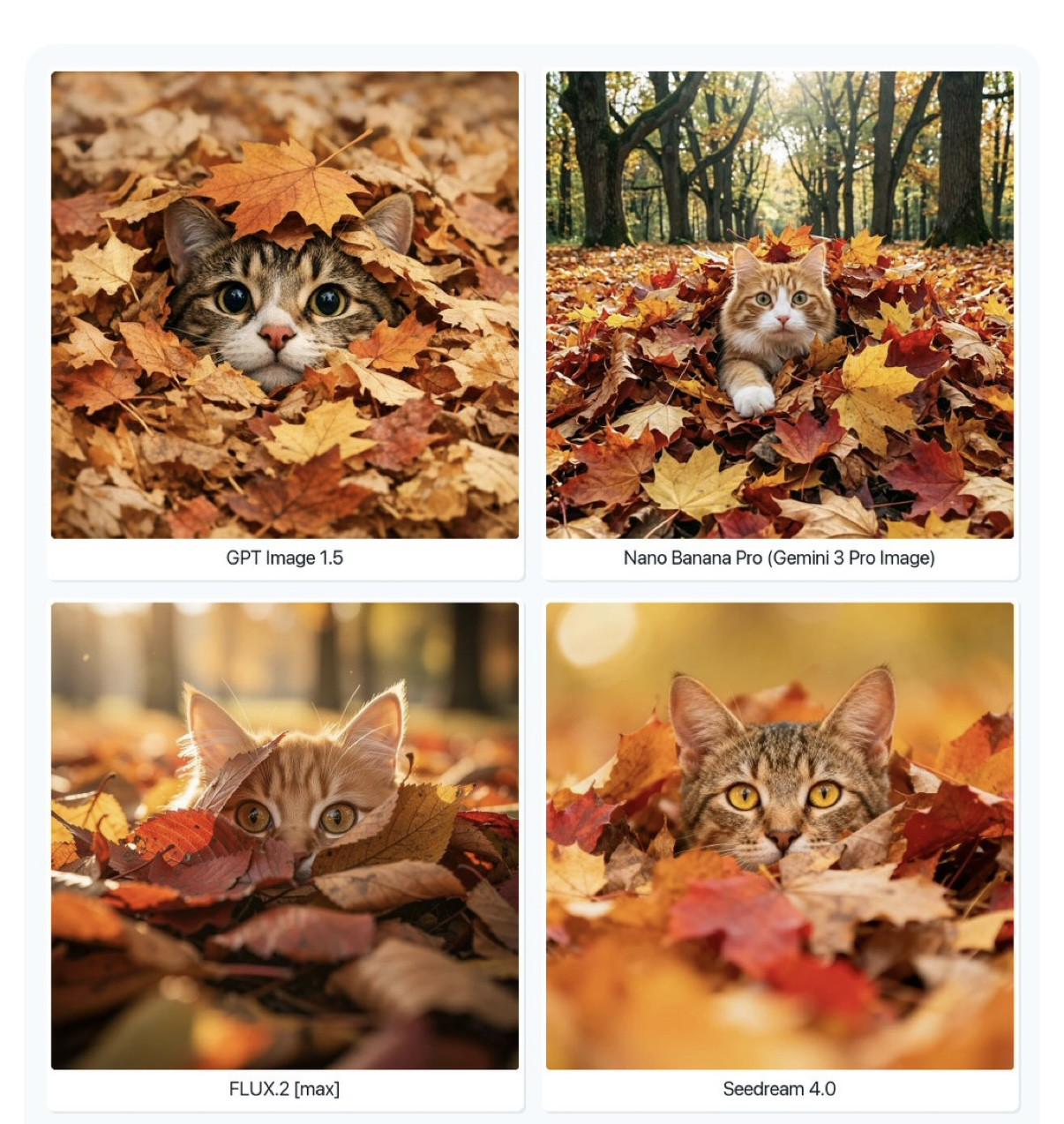 网友和机构也从多个方向进行了测试。ArtificialAnalysis用目前排行前四的图像模型做了一些测试。第一个是文生图:一只好奇的猫从一堆秋叶中探出头来。