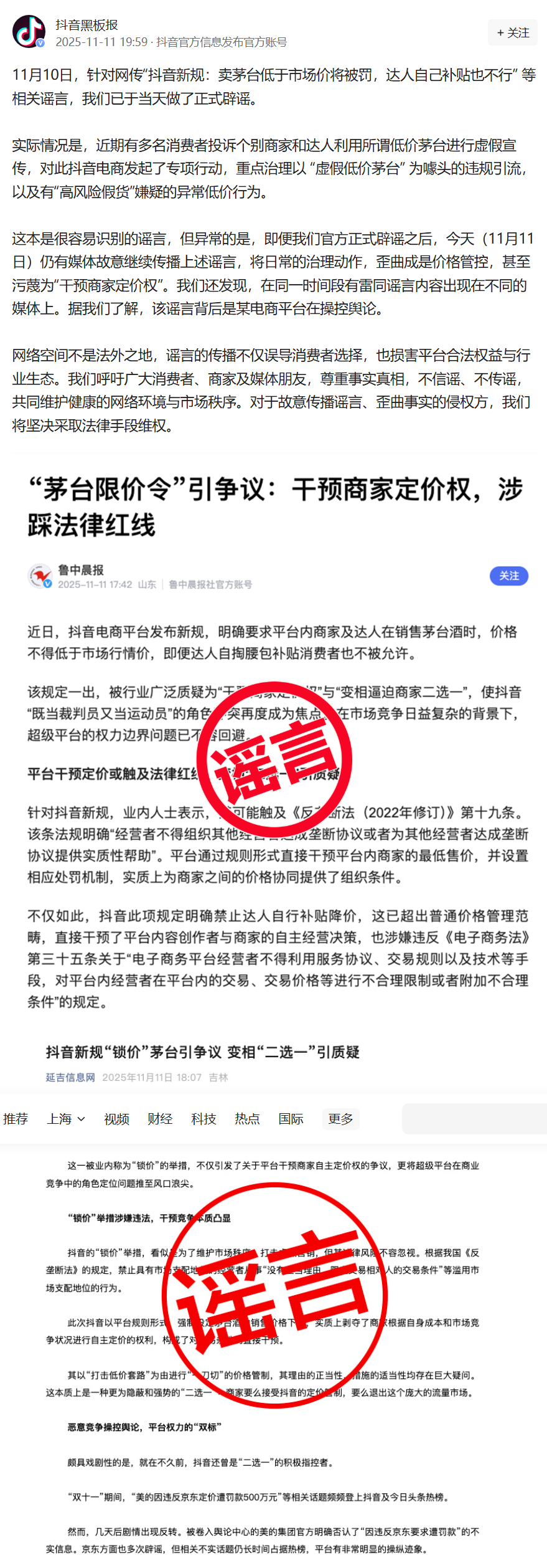 针对“卖茅台低于市场价将被罚”相关不实传言,抖音官方再度回应针对“卖茅台低于市场价将被罚”相关不实传言,抖音官方再度回应